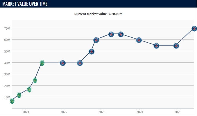 努诺-门德斯现年23岁,葡萄牙国脚,当今的德回身价为7000万欧,为左后卫第一东谈主。2021年夏天他从葡萄牙体育租赁加盟巴黎,2022年3800万欧买断。