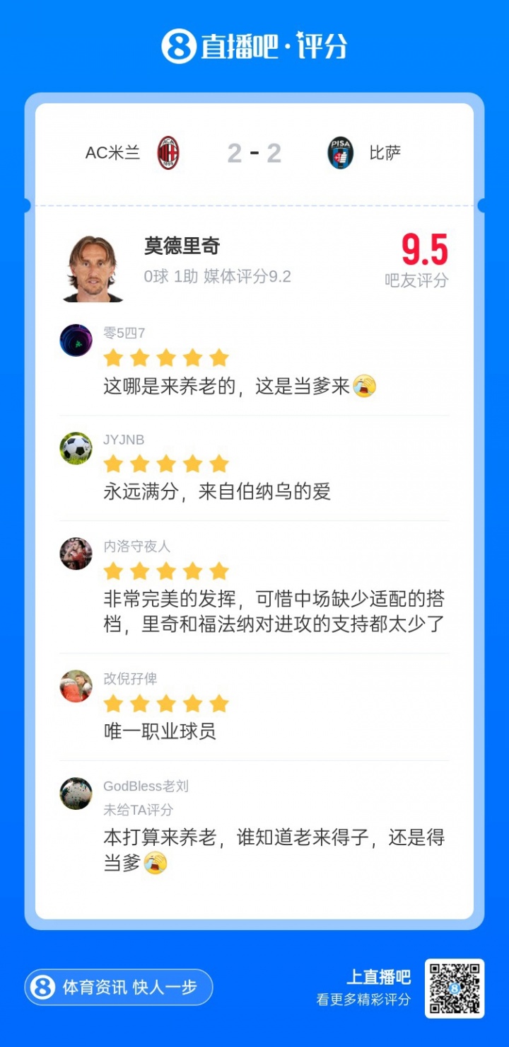 10月25日讯 意甲第8轮,AC米兰主场2-2战平比萨,40岁莫德里奇助攻阿特卡梅远射绝平,赛后魔笛当选全场最好球员。