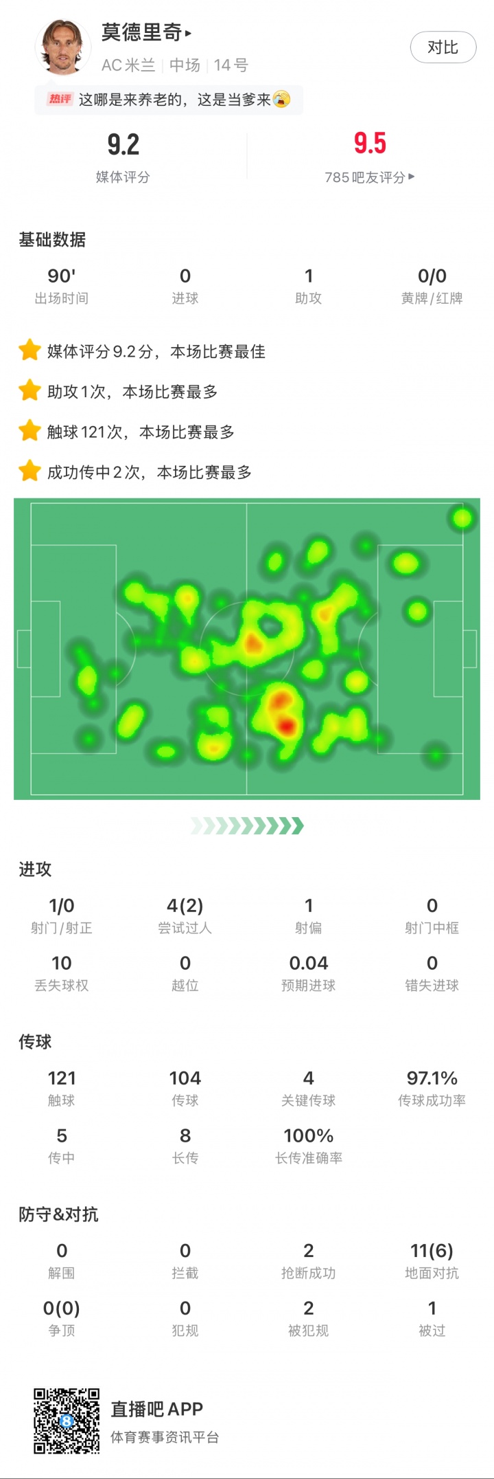 本场比赛,莫德里奇打满全场取得9.2分的高分,4次尝试过东说念主2次得胜,121次触球,104次传球,传球得胜率97.1%,4次要津传球,送出1次助攻,8次长传一起得胜,2次抢断得胜,11次大地抵拒6次得胜。