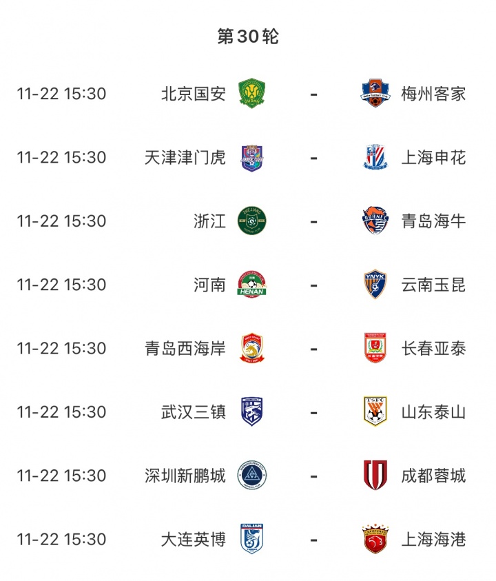 不外要见证本赛季的中超冠军出身还需要22天的恭候,原因是凭证赛程,第30轮中超8场比赛被设定在11月22日15:30同期进行。