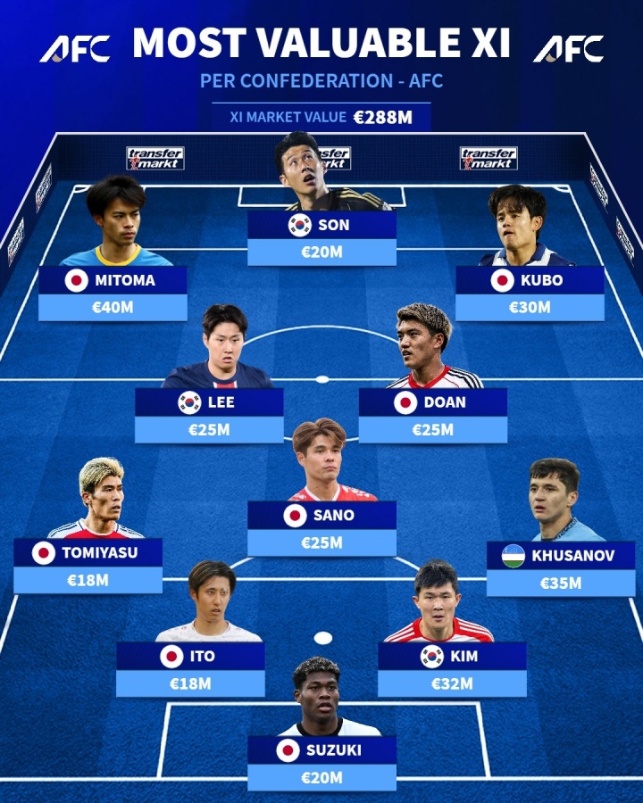 先锋:孙兴慜(2000万欧)、三笘薰(4000万欧)、久保建英(3000万欧)