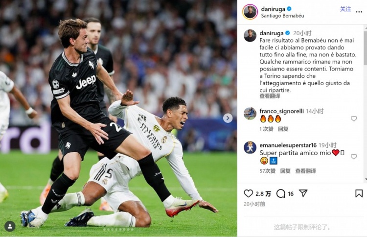 鲁加尼此役为尤文踢满全场,他在支吾媒体上晒出比赛像片,配文:“在伯纳乌球场得到好遵守从来齐退却易,咱们拼尽全力斗争到终末一刻,但也曾不够。”