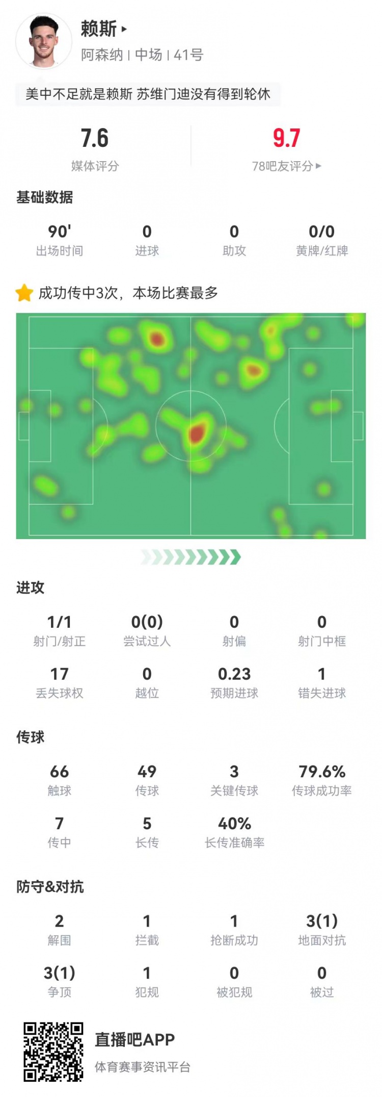11月27日讯 阿森纳在本轮欧冠镇守主场3-1力克拜仁,赖斯本场数据如下: