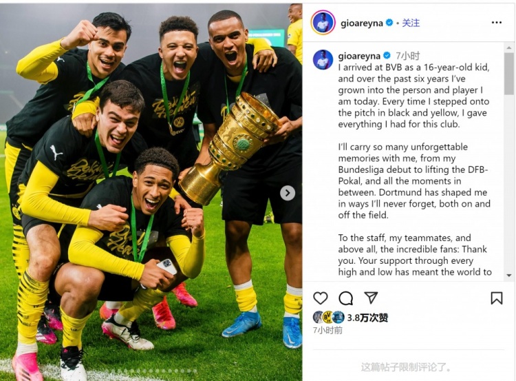 小雷纳社媒写说念:“我16岁时加入多特蒙德,往时6年间我成长为如今的球员,每次身披黑黄战袍踏上球场,我王人为这家俱乐部倾尽全力。