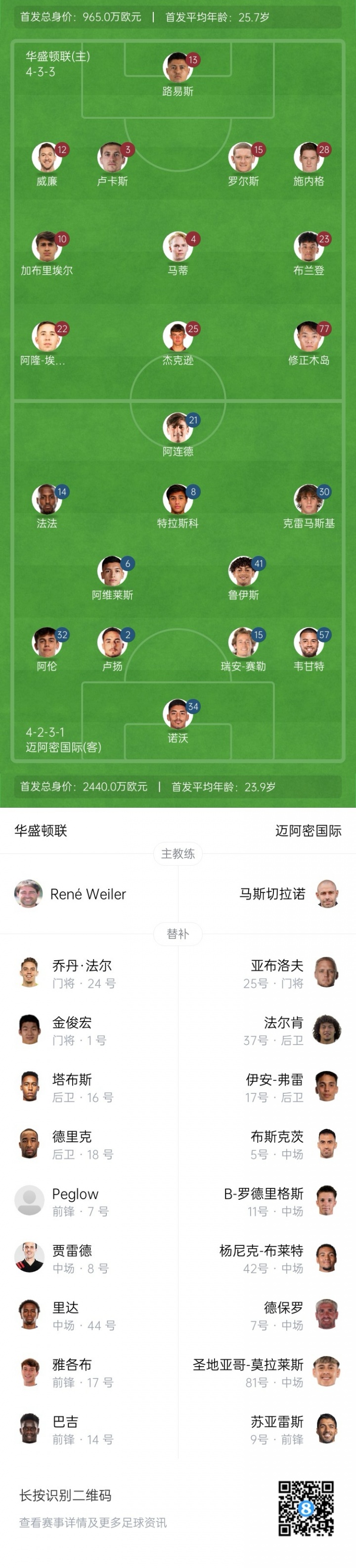 迈阿密海外替补:25-亚布洛夫、17-伊安-弗雷、37-法尔肯、42-布莱特、5-布斯克茨、81-圣地亚哥-莫拉莱斯、11-B-罗德里格斯、7-德保罗、9-苏亚雷斯