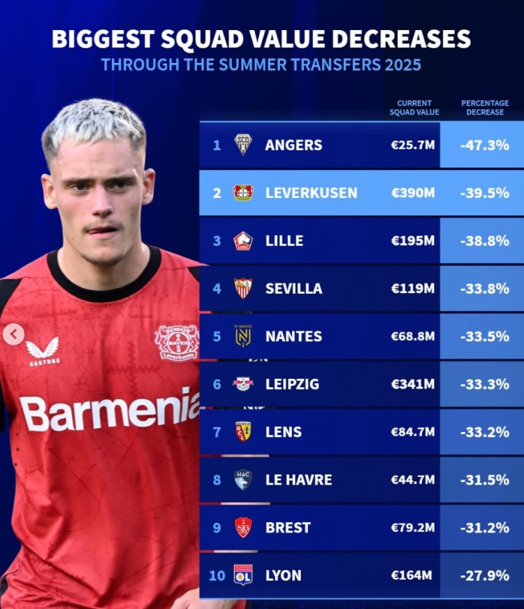 9月7日讯 《转会商场》统计了今夏转会窗事后的总身价下降比例情况,昂热居首,法甲7队在列。