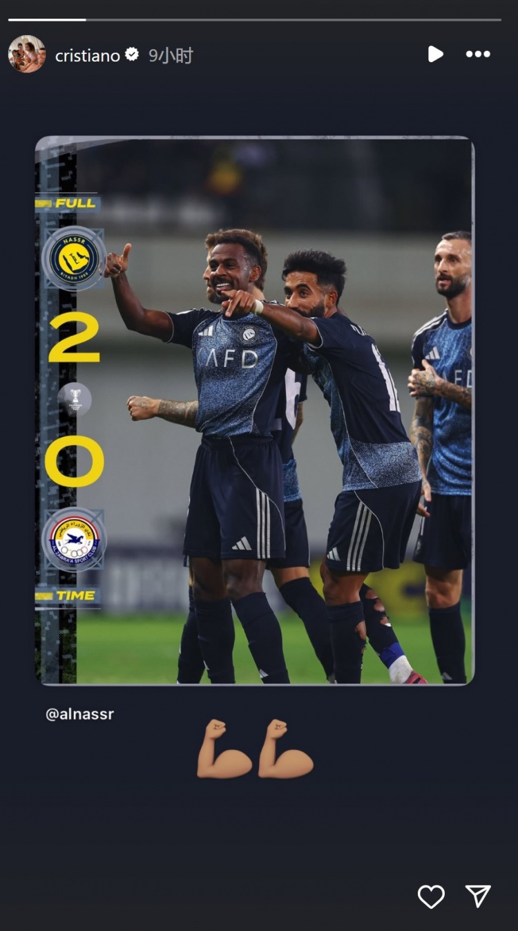 此役C罗轮休莫得出战,他在外交媒体上晒出比赛海报,庆祝利雅得告捷取胜。