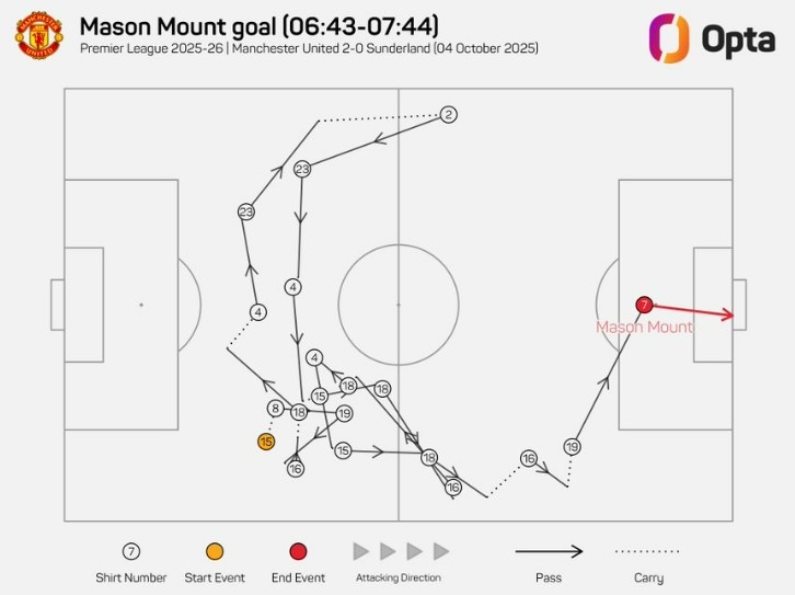 据统计,芒特进球前历程18次传球,这是本赛季英超进球中最多,而曼联上一次进球前有如斯多传球还在2023年9月(B费进球)。