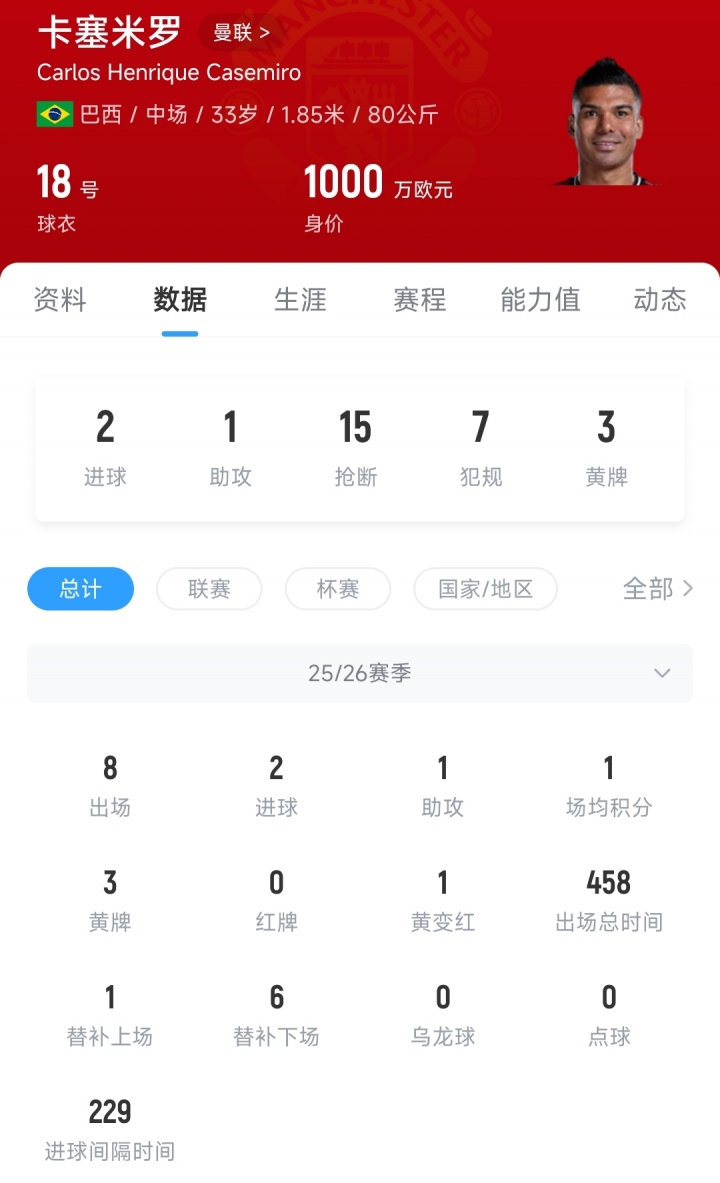 本赛季卡塞米罗动作曼联的主力后腰,出战8场比赛共458分钟,孝顺2粒进球和1次助攻。卡塞米罗在场的技艺内,曼联仅丢掉3球,而卡塞米罗不在场的技艺内,曼联丢掉了13球。