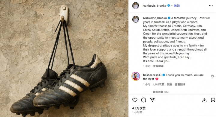 71岁前国足主帅伊万科维奇在社媒发文,崇敬文书退休,他暗示我方以球员和教师身份飞驰足坛逾六十载,是时辰该别足坛了。