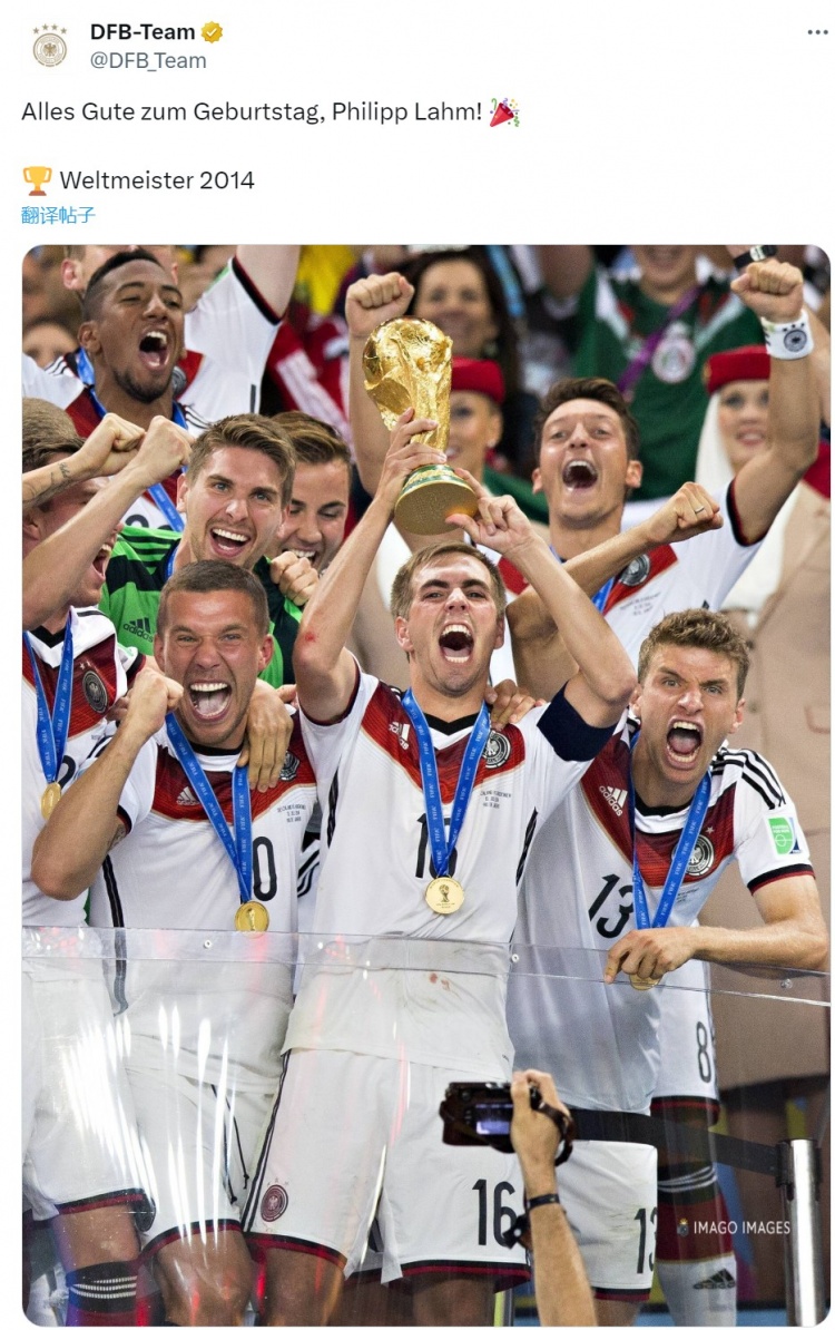 德国队社媒晒出拉姆捧起鼎力神杯的像片,配文:“祝2014年寰宇杯冠军拉姆诞辰满足!”