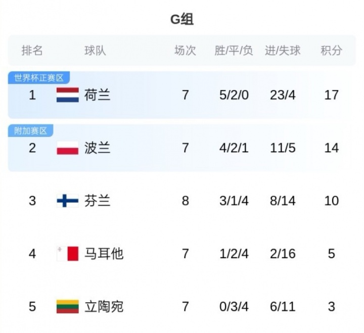 G组荷兰本轮未能打败波兰,荷兰17分,波兰14分,荷兰手抓13个净胜球上风。末轮荷兰对阵立陶宛,波兰对阵马耳他。