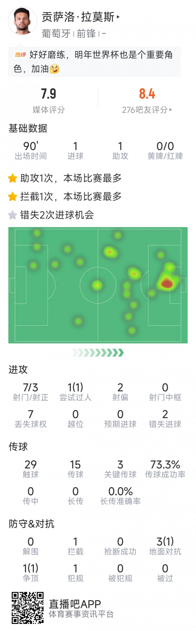 11月17日讯 在本轮世初赛,葡萄牙9-1打败亚好意思尼亚,贡萨洛·拉莫斯出任中锋传射立功,以下为他在本场数据: