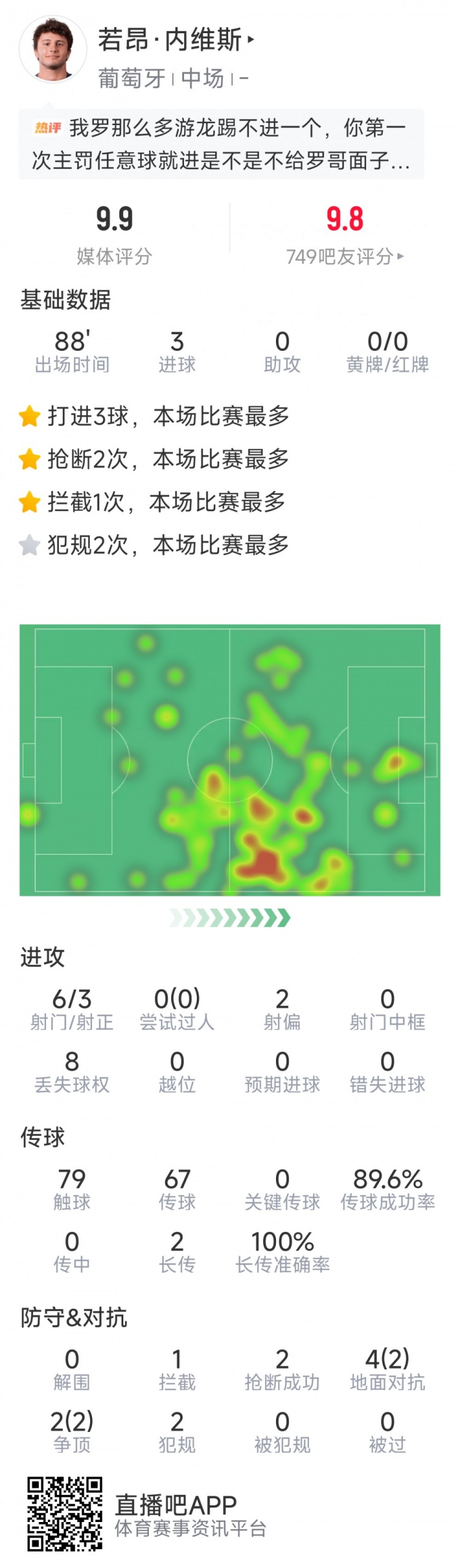 11月16日讯 在本轮世初赛,葡萄牙9-1打败亚好意思尼亚,内维斯献艺帽子戏法,以下为他在本场数据: