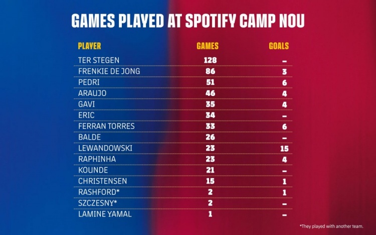 在现时气势中,五位队长中的四位占据了队内诺坎普球场出场次数榜的前哨:特尔施特根、弗兰基·德容、佩德里和阿劳霍。