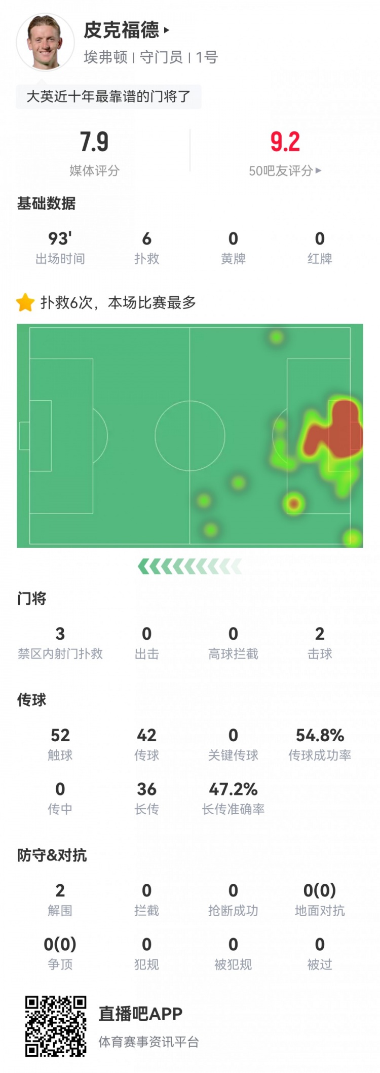 11月25日讯 本轮英超,曼联主场0-1十东说念主埃弗顿。此役皮克福德首发打满全场推崇出色,球员全场重心数据如下↓