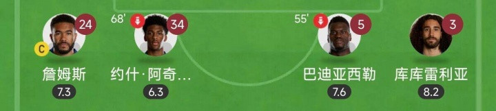 此战切尔西双中卫是巴迪亚西勒和19岁的青训小将阿奇姆彭搭档,阿奇姆彭是右后卫缔造,中卫是第二位置。切尔西的6中卫,伤了科尔维尔、韦斯利-福法纳和阿达拉比奥尤3东说念主,迪萨西则是被弃用,查洛巴红牌停赛。