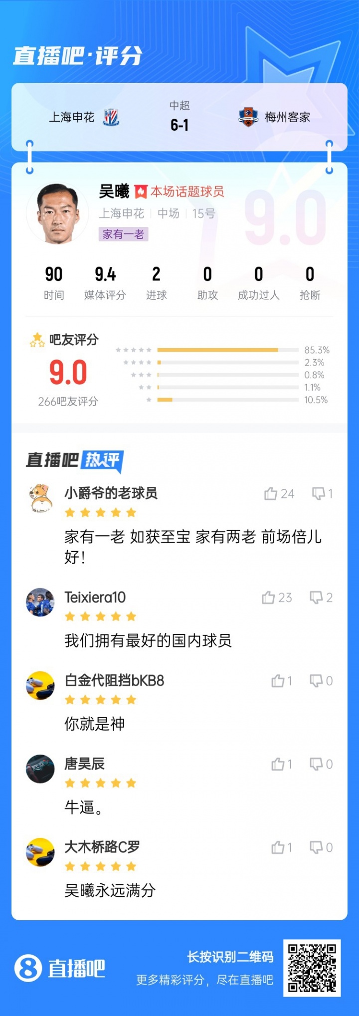 中超第26轮,上海申花主场6-1大捷梅州客家,36岁的队长吴曦梅开二度,作念出3次遏止2次突围,调换申花持续前行,保握对中超冠军的冲击!