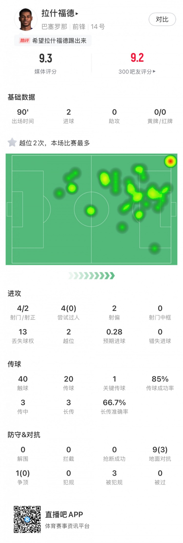 10月22日讯 欧冠联赛阶段第三轮,巴萨6-1打败奥林匹亚科斯,此役拉什福德代表巴萨首发出战打满全场,打进两球,球员本场数据如下: