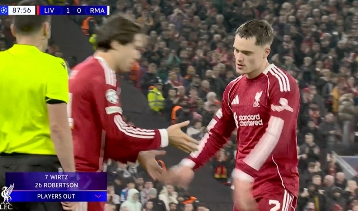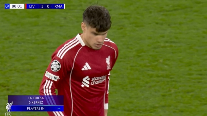11月05日讯 欧冠第4轮利物浦vs皇马第89分钟,利物浦再次作念出2个换东谈主调整,维尔茨、罗伯逊被换下,凯尔凯兹、基耶萨替补登场。