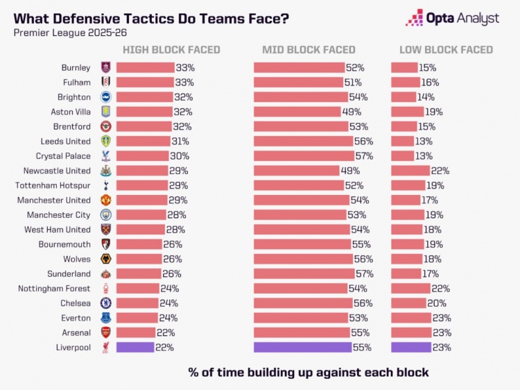 11月21日讯 据Opta统计,利物浦在每场英超比赛中的平均控球率为60.7%,高于任何其他球队,而他们78%的比赛时刻面临中位或低位驻防,是联赛中最高的。