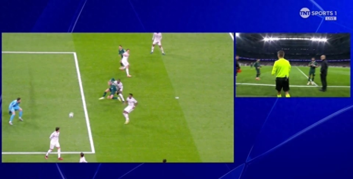 比赛进行到上半场接近落幕时,哈兰德在禁区内策应队友传中准备射门,却被吕迪格从死后拉倒。这一幕发生在主裁判克莱芒·蒂尔潘目下,但起初他并未立即吹停比赛。随后,在VAR教唆后,蒂尔潘决定判给曼城一粒点球。