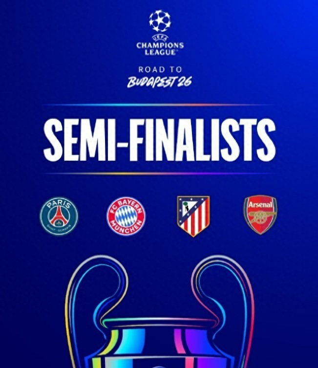 至此本赛季欧冠四强全部出炉,英超、西甲、法甲和德甲各有一支队伍入围。准总决赛 拜仁将同巴黎 圣日耳曼交手,阿森纳将会面对马德里竞赛 队。两局 准总决赛 分别于4月29/30日以及5月6/7日上演。