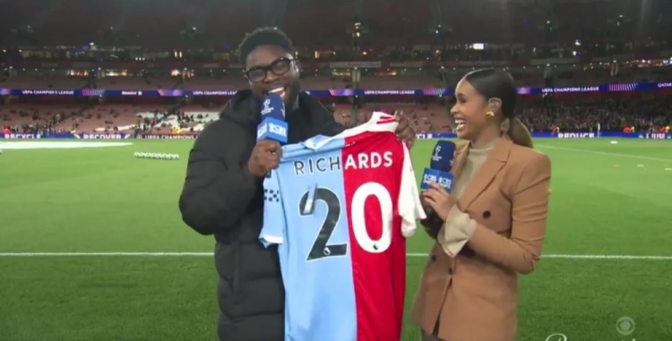 37岁的理查兹受邀现场批驳阿森纳vs马竞的欧冠比赛,当他站在镜头前时,转播员送给他一份相等的礼物。
