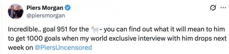 有名主抓东谈主皮尔斯-摩根在社媒发文推奖C罗:太不成想议了……(山羊图案,GOAT)打进了第951个进球!