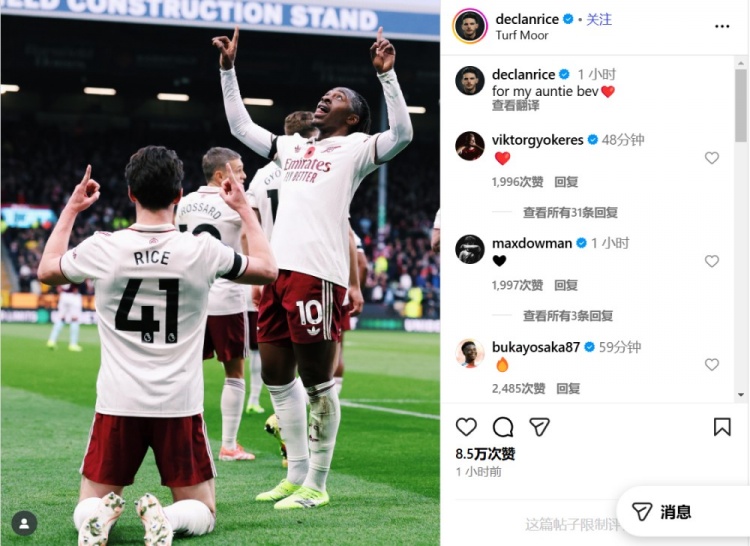 赖斯的姨妈贝芙近日死亡,阿森纳中场用进球献给了我方好奇的东说念主。
