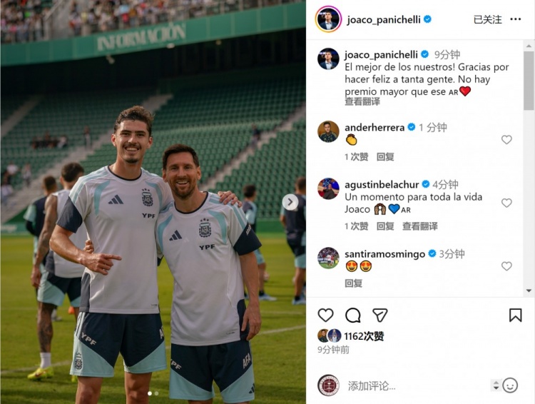 帕尼切利社媒晒出与梅西的合照,配文:“咱们之中最棒的!感谢你给多量东谈主带来昂然,(对我来说)再也莫得比这更好的赏赐了!”