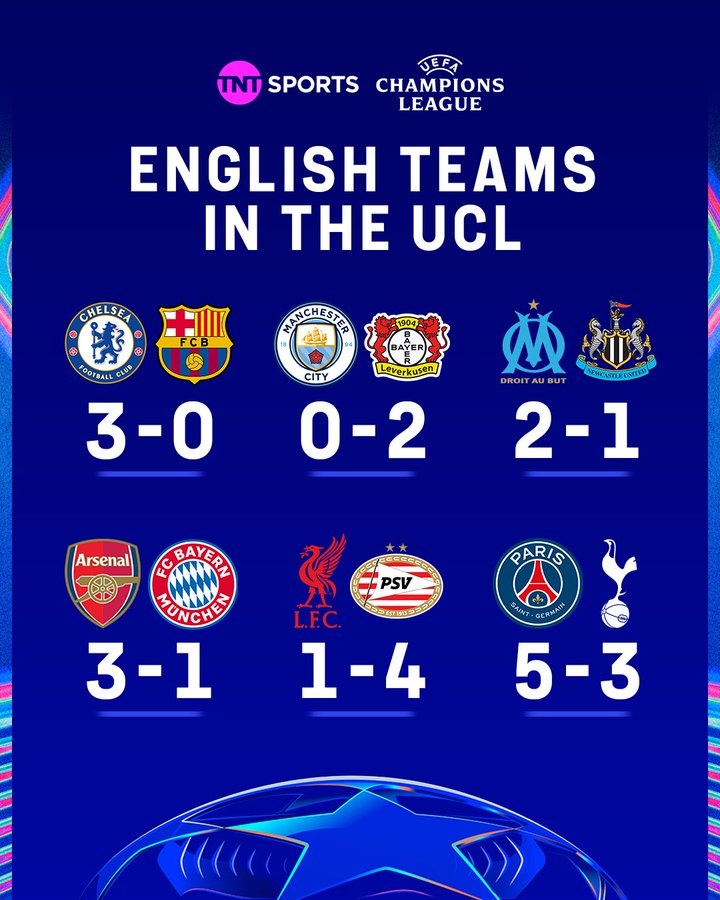 11月27日讯 本轮欧冠比赛日截止,英超球队获取了2胜4负的战绩。