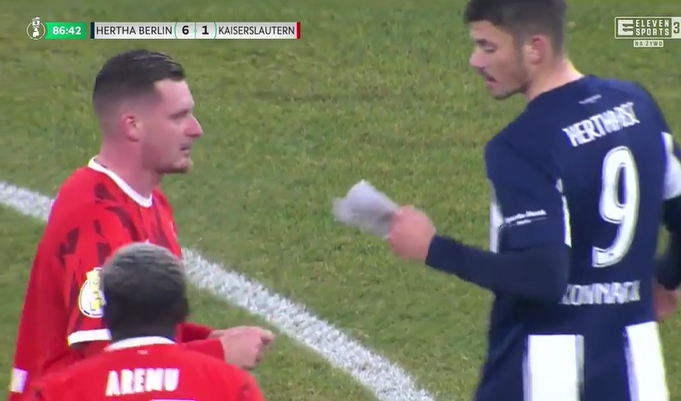 比赛时发生搞笑一幕,柏林赫塔在6-1造就情况下,9号前卫考纳茨基抢了凯泽斯劳滕队长里特从证实那边得回的计策纸条。