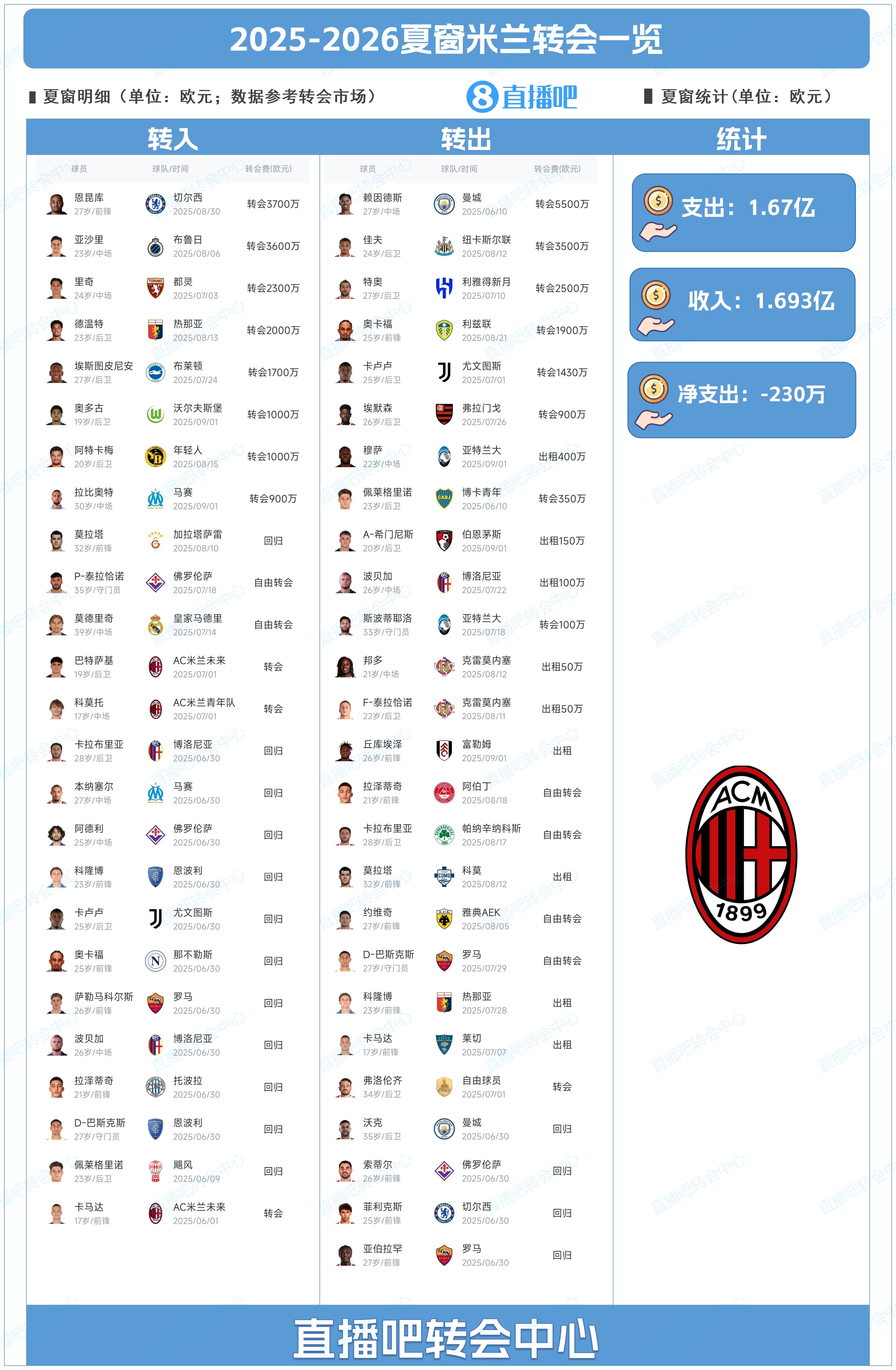 为吧友们追念了AC米兰今夏的转会操作,吧友们能打几分?