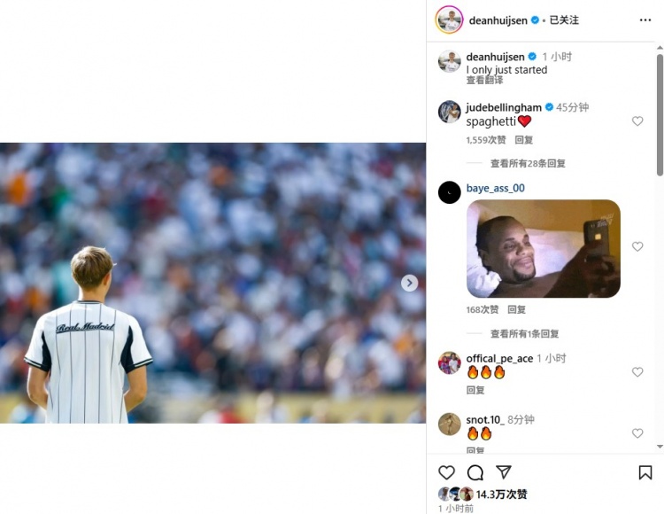 9月8日讯 皇马后卫赫伊森在大意媒体发文,贝林厄姆驳斥区互动。